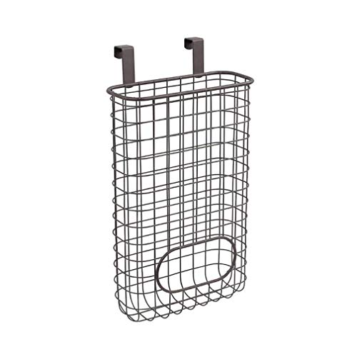 THE BESTSELLERS Over Cabinet Door Organizer is the perfect 2-in-1 space saver. The basket stores those unruly plastic grocery store bags that can be easily removed from the wide opening at the bottom. The opposite side keeps hand and dish towels conveniently within reach. Made of sturdy steel, the padded brackets simply slide over standard cabinet doors without the need for tools or installation. Perfect for the kitchen, bath or laundry room. Cabinet shelves may obstruct cabinet door from properly closing when the item is used….