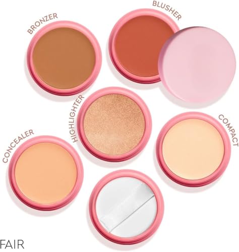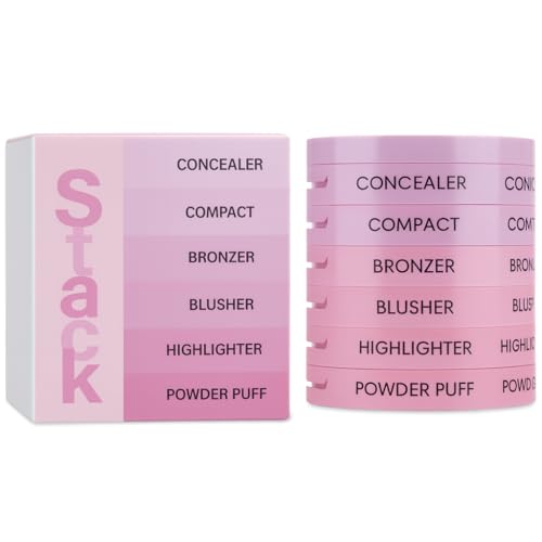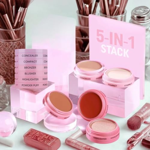 5-in-1 stackable makeup kit featuring concealer, compact powder, bronzer, blusher, and highlighter in a coordinated pink design