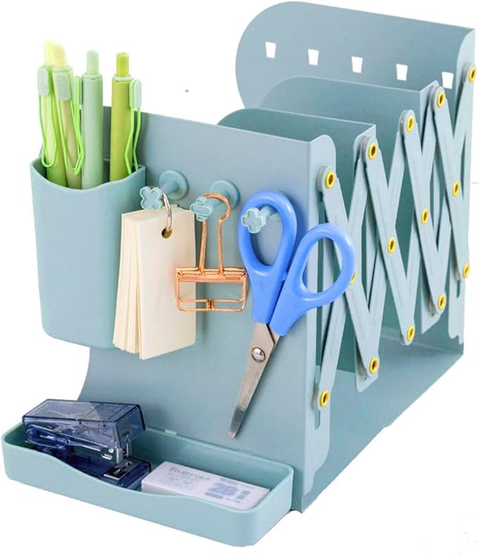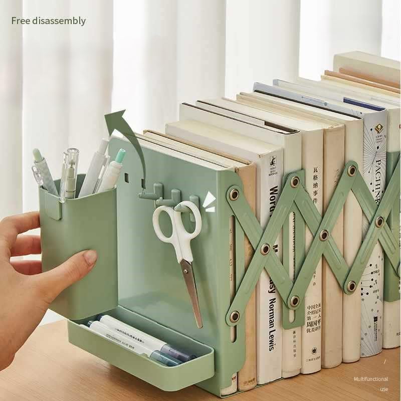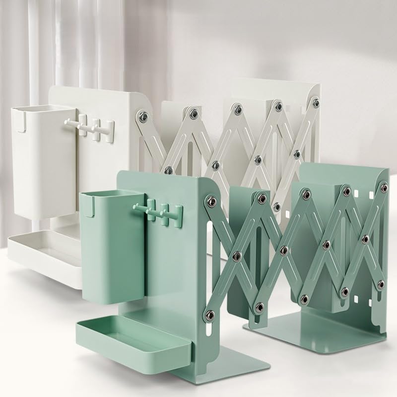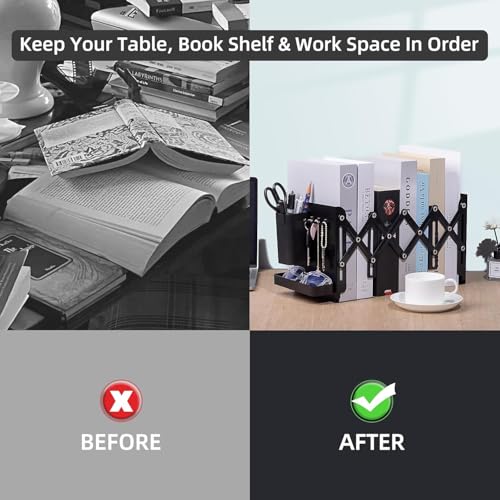 【Removable Accessories】Bookends for shelves with removable pen holder, tray, and 3 hook-ups, they can store pens, keys, glasses, scissors, knives, sticky notes, etc. Make your desk tidy and organized.