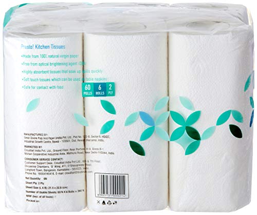 Presto! Kitchen tissue rolls are made from 100% natural virgin paper. They are soft to touch and highly absorbent. This pack of 2 ply kitchen rolls comes with 60 sheets per roll. These paper towels are safe for contact with food and can be used to line containers before keeping food in them or to blot excess oil from cooked food.