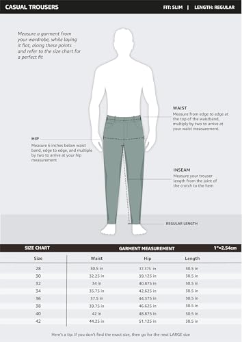 An Amazon brand, Symbol is built on the pillars of quality, reliability and affordability, offering a range of lifestyle essentials that help you look good every day. Symbol brings a range of classic chinos in a variety of colors that keep you subtle & comfortable. Built for varsatility, our essential pair of chinos find place in every man’s wardrobe. This pair of Relaxed fit stretchable cotton chinos are styled with slant pockets on the side and buttoned welt pockets at the back. Wear them to work with a classic shirt or keep it casual with a polo.