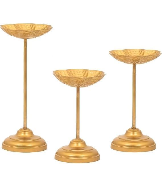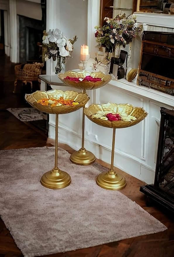 Celebrate Traditions with Style Bring timeless elegance into your home with the MF IMPEX Handcrafted Urli Bowl with Stand (Set of 3 – Taj Set). Featuring a lotus-inspired bowl design in a luxurious gold finish, this set is perfect for floating flowers, rose petals, or tealight candles, instantly creating a warm and festive ambiance. Designed in three different heights (40 cm, 35 cm, and 30 cm), the urli bowls create a stunning layered arrangement for any corner of your home. Place them in your living room, entrance, pooja room, or dining area to elevate your décor. A perfect blend of tradition and modern craftsmanship, this urli set is ideal for Diwali decorations, weddings, housewarming ceremonies, and festive gifting. Crafted with care and durability, the MS Art Gallery Taj Set Urli will remain a centerpiece in your home décor collection for years to come. Urli is an eye catching product by its distinctive shape, the urli makes a handsome addition to the decor of any room, and now, you can enjoy the beauty of one that is made according to the time-honored traditions in your own home more attrective.