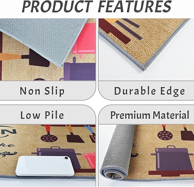 - Experience the features that make Kitchen Mat stand out: anti-fatigue technology for comfort that lasts, waterproof and stain-resistant properties for easy maintenance, and a non-slip backing for stability and safety.