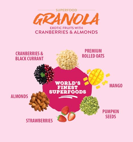 Bagrry’s Exotic Fruits Granola is a delicious fusion of 13 superfoods, crafted to add an exotic, nourishing twist to your breakfast. This vibrant blend combines juicy cranberries, tropical mangoes, sweet strawberries, creamy bananas, tangy black currants, and luscious dates with the crunch of almonds, nutrient-rich rolled oats, pumpkin seeds, and light, crispy multigrain crispies.