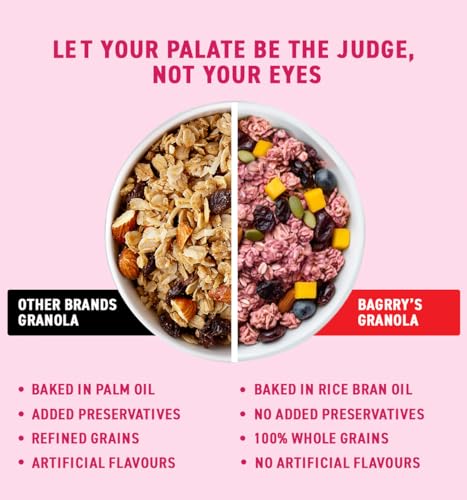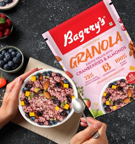 Bagrry’s Exotic Fruits Granola brings you the goodness of real fruits and nuts blended with multigrain crispies, rolled oats, and wheat bran, offering a nourishing, high-fibre breakfast cereal that also works as a perfect mid-day snack.