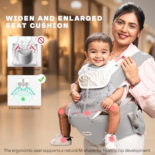 Built-In Ergonomic Baby Hip Seat: The wide and stable baby hip seat ensures proper “M” position for healthy hip growth recommended for longer wear and outdoor comfort.
