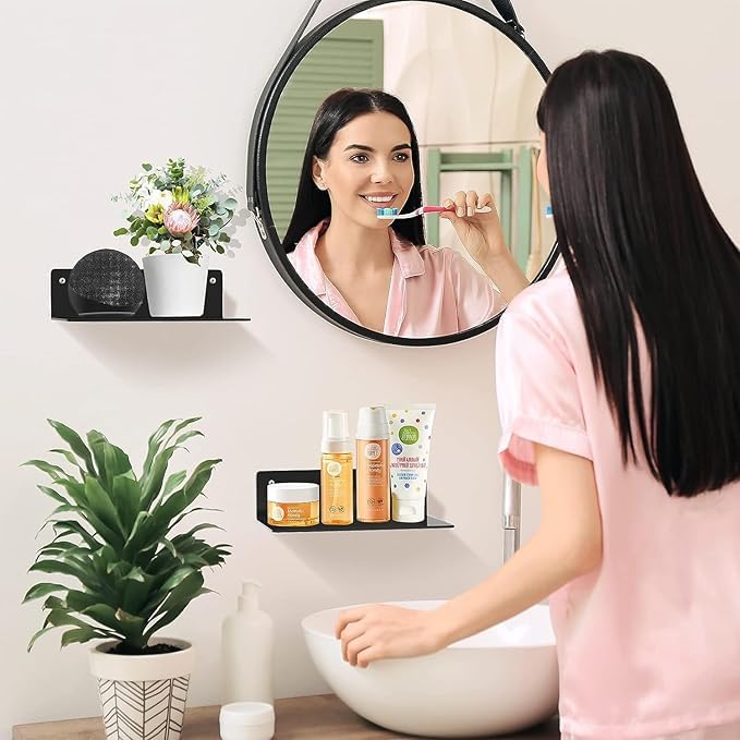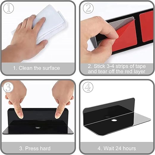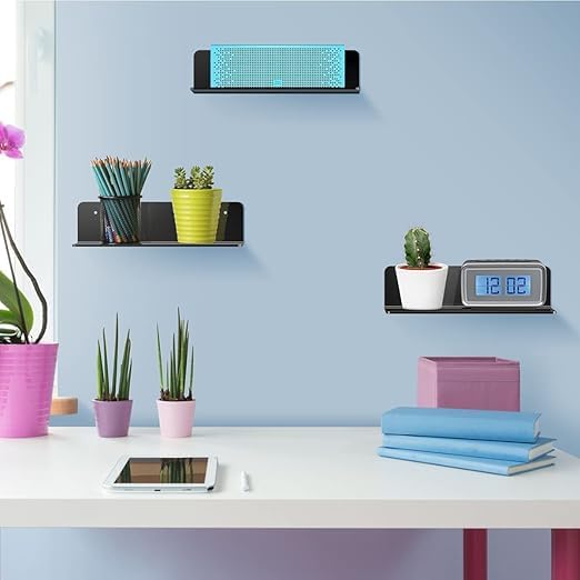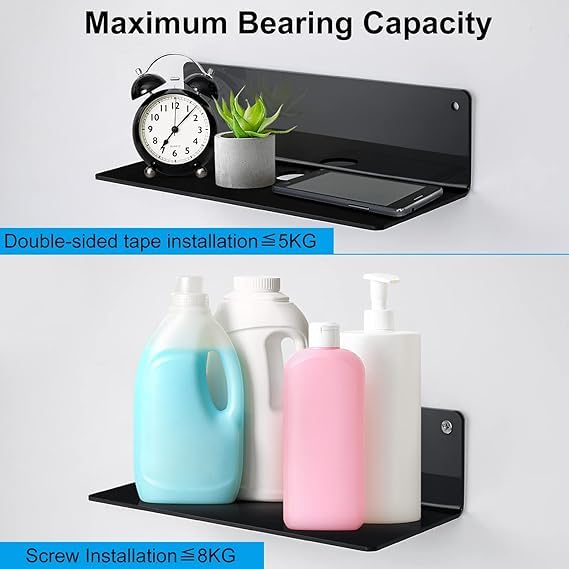 “4Pcs Acrylic Floating Shelf, 9 Inch Small Wall Shelf for Bedroom, Kitchen, Bathroom Display Shelves with Stickers, No Drill”