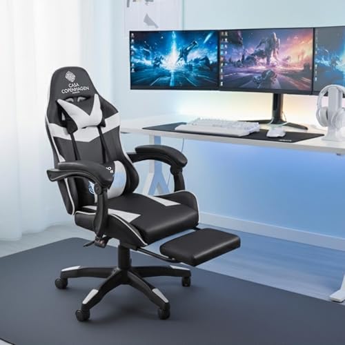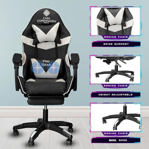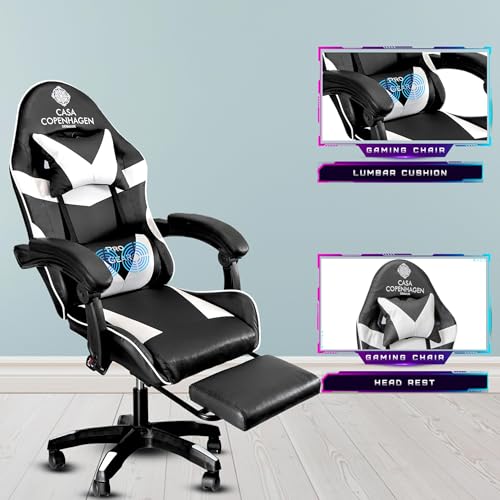 Casa Copenhagen Designed in Denmark,High-Back Italian Leather Gaming Ergonomic Chair with Advanced Mechanism & Electric Back Massager, Memory Foam Seating & Multi Function Arm-Rest – White & Black