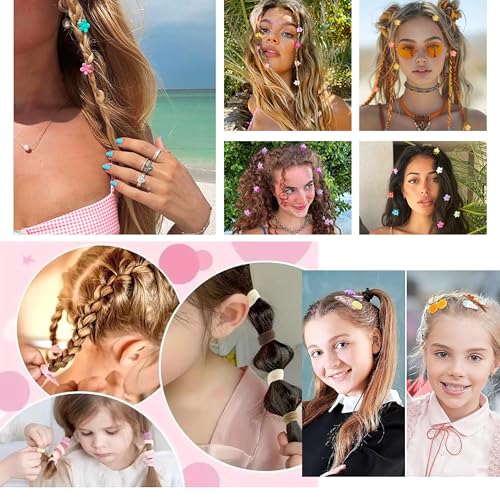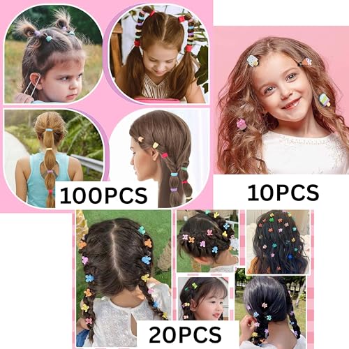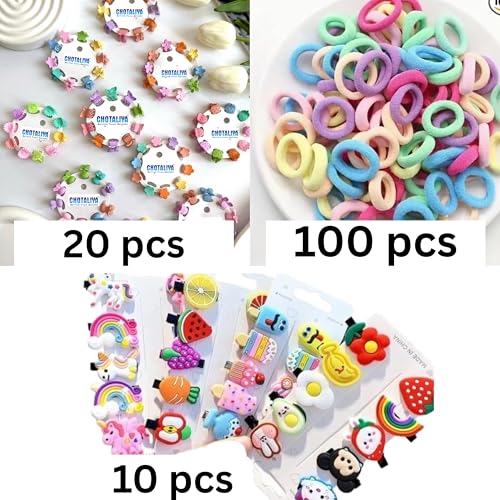 COMPLETE SET: 129-piece hair accessories collection 20 pcs Mini Colorful Baby Hair Clips Set For Girls 100pcs Baby Hair Ties for Girls and Kids 10pcs Fruits, Cartoon Characters baby card featuring an assortment of pastel-coloured clips for versatile styling options
