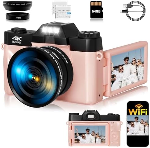 Multifunctional 4K Camera & Best Choice for Beginners: The compact digital camera supports autofocus, framing grid, fill light, video pause function, record while charging, time-lapse, slow motion, self-timer, 22+filters, looping recording and more. With a knob on the top of the camera, you can switch between photos, videos, time-lapse photography, and other modes. You will get Pink Camera x1, 64GB TF Card x1(inside the camera), USB Cable x1, Rechargeable Li-ion Battery x2, Instruction Manual x1, Wide/Macro Angle Camera Lens x1