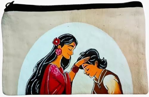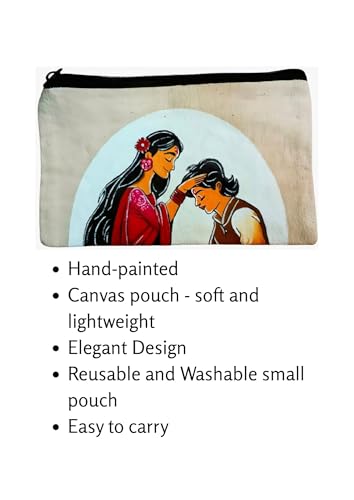 ARTISANAL CRAFTSMANSHIP: Beautifully hand-painted canvas pouch featuring traditional Indian artistic elements with vibrant colours and detailed brushwork