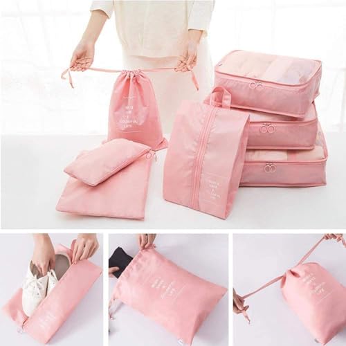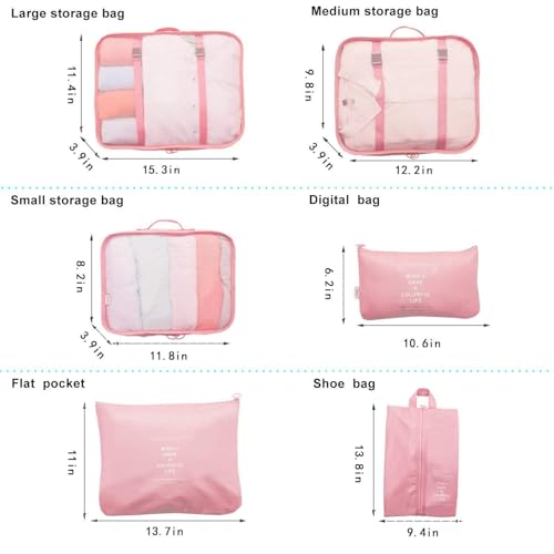 ✈ HOW TO EFFECTIVELY USE THE PACKING CUBES AND LAUNDRY POUCHES: #1 large clothes bag/cubes can fit 10-12 shirts; #2 medium cube can fit another 6-8 shirts; #3 small cube can fit 4-6 shirts; #4 underwear bag for bra underwear and socks; #5 cosmetic bag can fit your make-up, lipstick and personal cosmetics #6 toiletry bag for your toiletry accessories and electronic accessories; #7 BONUS drawstring bag for shoe bag which can fit 1 pair of slippers and 1 pair of sneakers. You can also use laundry.