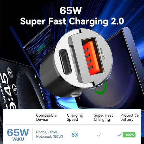 【HIGH SPEED】Car charger is equipped with dual PD QC ports, supports fast charging two devices at full speed, and the maximum output is 65W in total (18w Max QC 3.0 & 65w Max PD). Compared to the original charger, This adapter charges up to 4X faster, charges devices from 0% to 80% within 30 minutes. while charging save more time and create good travel times for you.