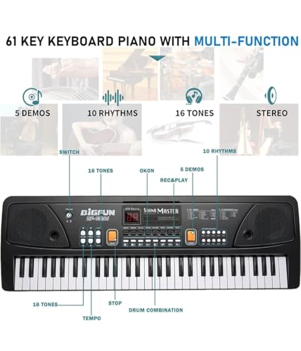 Electronic Piano Keyboard – 61 Keys, 16 Tones, 10 Rhythms, 6 Demos, 8 Percussions. Microphone Included. USB Included. Please note : there is only 1 speaker in the product