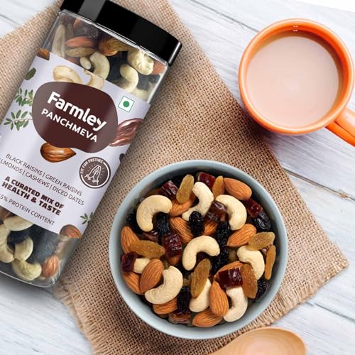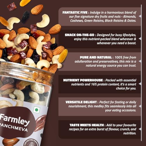 Delightful Blend of Farmley’s 5 Signature Dry-Fruits-Almonds, Cashews, India’s first SULPHUR FREE Raisins, walnuts and Dry Dates. Suitable to boost immunity suggested take with hot milk. Gluten free, Improves cholesterol levels, Promotes digestive health and Increases energy levels. Specially Beneficial “DURING FASTING” as it is a Great Source of Instant Energy.