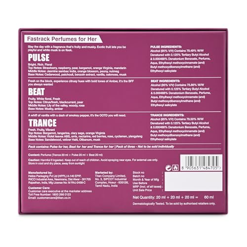 Crafted By: Beat for Her: Amelie Jacquin || Pulse for Her: Carmita Magalhaes || Trance for Her: Philippine CourtiereScent Type – FreshFastrack Gift Pack: 20ML Trance for Her + 20ML Beat of Her + 20ML Pulse of HerFamily: Beat for Him: Citrus Marine Spicy || Trance for Her: Oriental Gourmand WoodyPerfect for Gifting to Couples, Family, Colleague and FriendsKeep your fragrances in a cool, dry place away from direct sunlight and heat sources