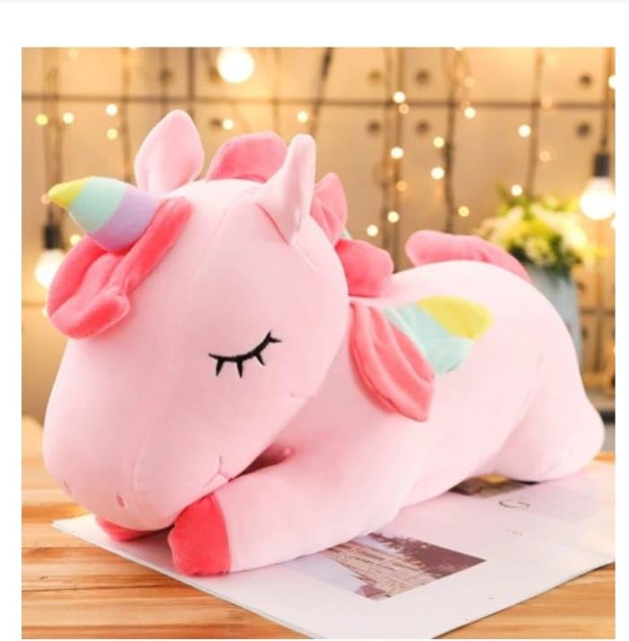 ADORABLE DESIGN: Charming pink unicorn plush toy features a peaceful sleeping expression with closed eyes, rainbow-coloured mane and tail, and sweet lying down pose that appeals to children and unicorn lovers