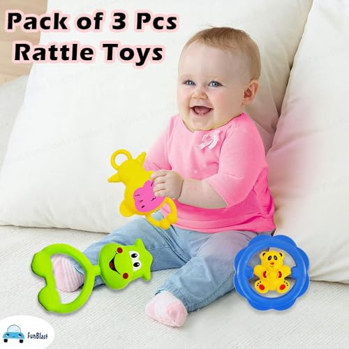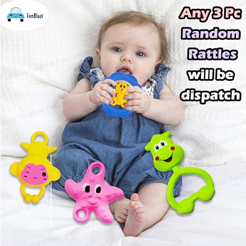 In The Box – Set of 3 Pcs Rattles and Teether for Babies, Colourful Lovely Attractive Infant toys for baby’s development.