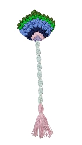 HANDCRAFTED DESIGN: Meticulously crocheted bookmark featuring a stunning multi-layered ‘Peacock Fan’ inspired floral pattern in vibrant shades of green, blue, and pink