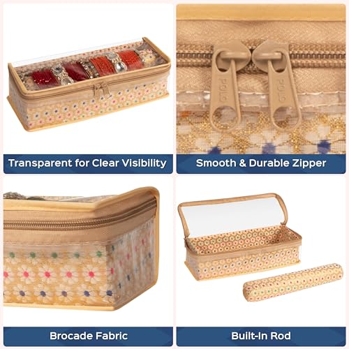 Material: Brocade Material & having supportive frame(made of hardboard) is installed on the boundaries of the transparent box which serves better safety of the bangles.