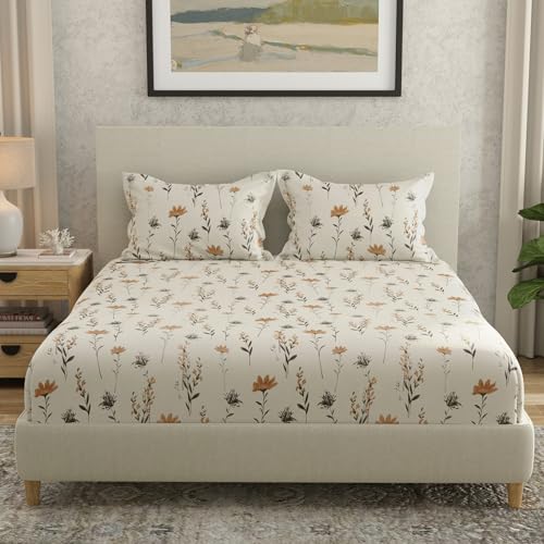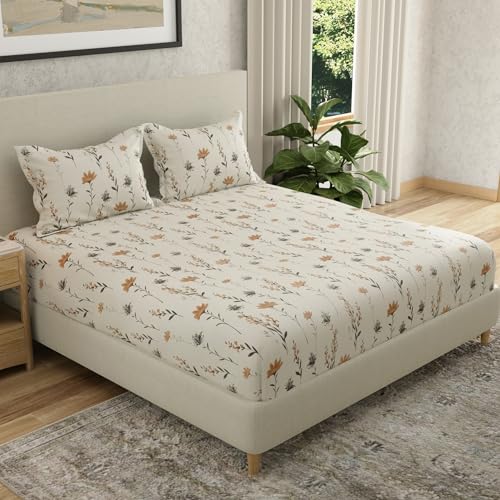HUESLAND by Ahmedabad Cotton 144 TC Cotton Bedsheet for Double Bed King Size with 2 Pillow Covers | White & Tangerine Orange