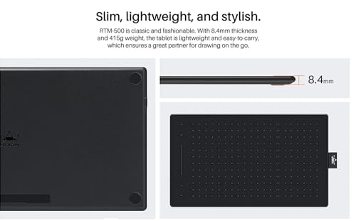 Slim, lightweight, and stylish- RTM-500 is classic and fashionable. With 8.7×5.4 inch sufficient working surface, 8.4mm thickness and 415g weight the tablet is lightweight and easy-to-carry, which ensures a great partner for drawing on the go.