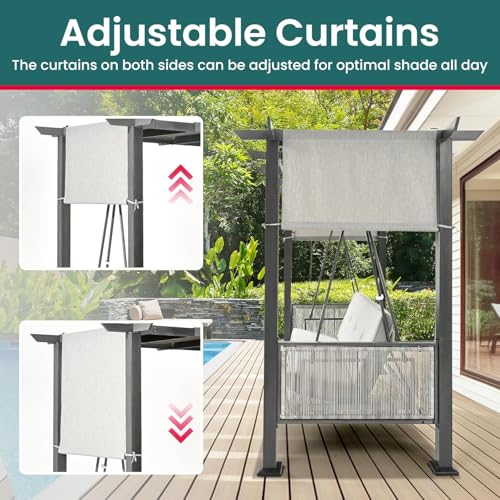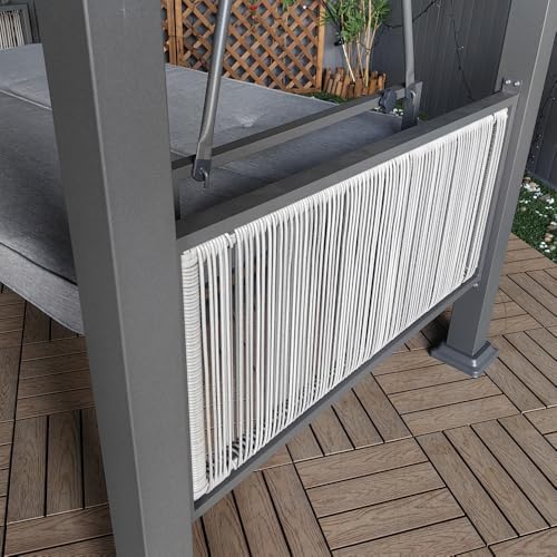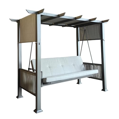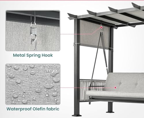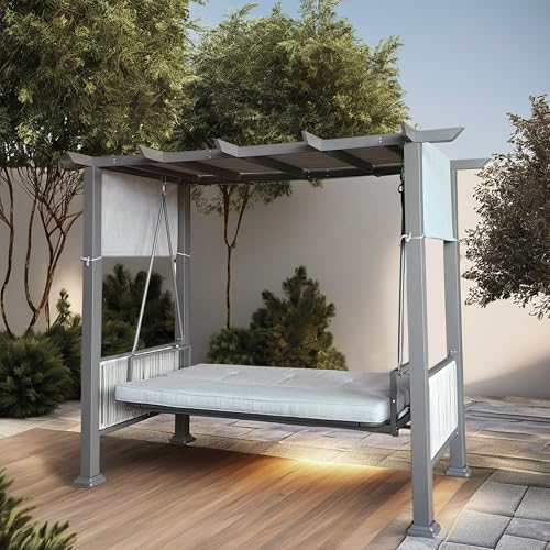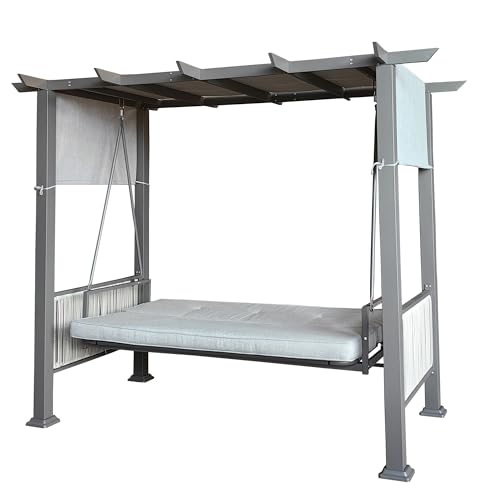 ⦁ VERSATILE DESIGN: Contemporary outdoor swing with pergola frame that converts into a daybed, featuring a grey metal frame and rooftop covering for sun protection