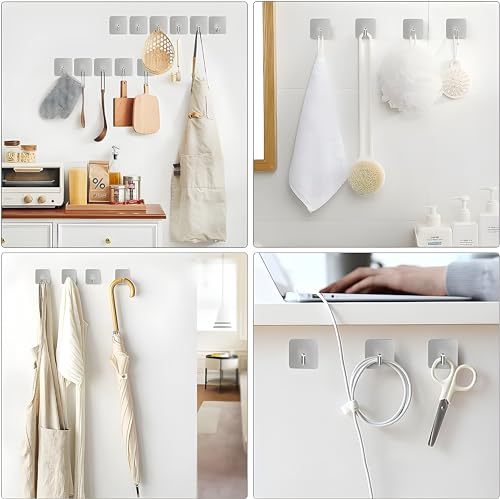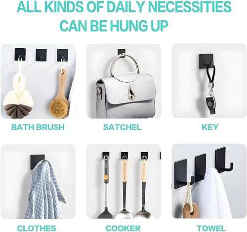 Adhesive wall hooks with heavy duty adhesive that immediately and securely attaches to any smooth surface, strong and reliable, stays in place for a long time and not easy to fall off.