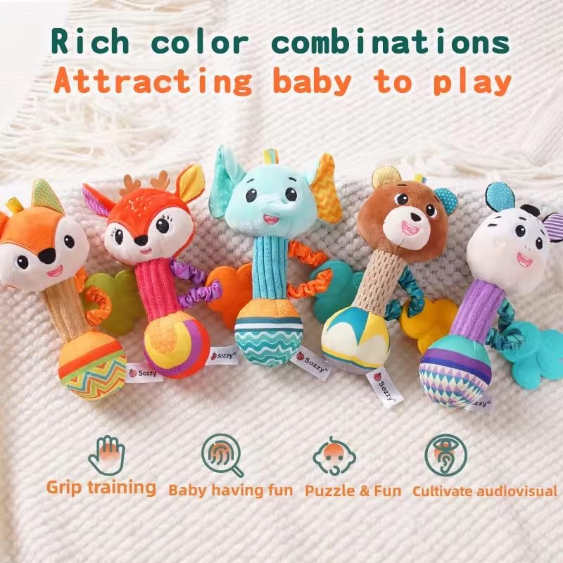 Crinkle Ear – Soft crinkle sounds that delight tiny hands and encourage tactile exploration.Bell Sound – Gentle chimes to enhance auditory skills and hand-eye coordination.Teether – Safe, textured teether to soothe sore gums and support oral motor development.BB Sound – Squeeze-activated squeaker to spark giggles and cause-and-effect learning.