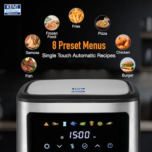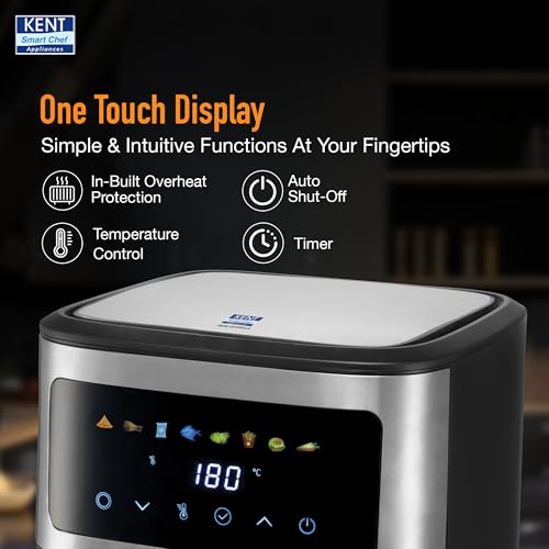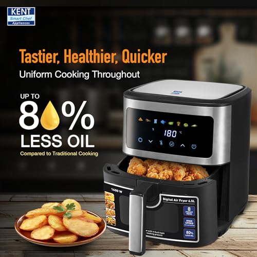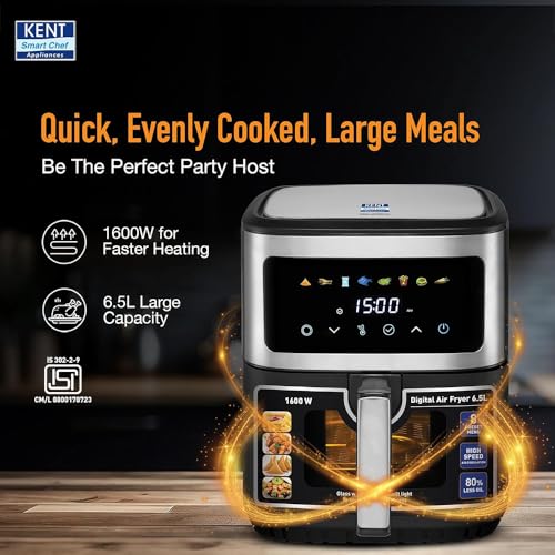 Go-To for Healthier Cooking: Upgrade your kitchen with the KENT Digital Air Fryer 6.5L, powered by 1600W of powerful performance and 360° rapid air technology. It fries, bakes, grills, and roasts using 80% less oil to ensure crispy, delicious results every time.