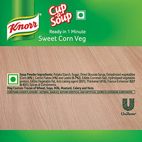 Knorr Sweet Corn Veg Cup-A-Soup is a perfect blend of corn, carrots, cabbage makes this cup-a-soup an instant hit. Knorr Sweet Corn Veg Cup-A-Soup satisfies your small hunger pangs in just 1 minute. It’s crunchy, delicious and easy to make everytime. Made with 100% real vegetables and no added preservatives, this soup is ready in three simple steps. So now enjoy Restaurant like delicious Soup at home.Knorr Soups range comprises of 11 delicious flavours of 4 serve soups and 7 flavours of Cup-a-soup. Great taste is in our Nature! Knorr has gone to great lengths to ensure a perfect blend of ingredients and consistency that give you Restaurant like Soup at home.About Knorr:Just like you, we love everything about food, because no delicious meal is cooked without love. Love for carefully selected ingredients, flavours and spices, or the aroma of dinner wafting through your home. Love for the people you feed everyday; your family and friends, relatives and guests, the people that matter to you the most. With Knorr as your cooking partner, you can serve your loved ones nutritious and flavourful meals at home. Soup Fun Fact – The word ‘soup’ is of Sanskrit origin! It is derived from the su and po, which means good nutrition.