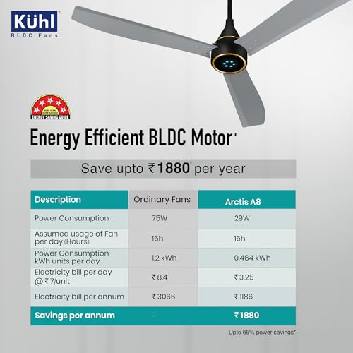 Energy Efficient and Power Saving up to 65% – Kühl Stylish Arctis Fans come with revolutionary and super energy-efficient BLDC motor technology that consumes less energy. Kuhl fans consume 65% less power consumed by ordinary fans. Kühl Stylish Arctis Fans run on just 29 watts at full speed whereas ordinary induction fans run on approx. 80 watts. Kühl Stylish Fans offer better speed versus torque characteristics. It ensures high dynamic response and efficiency. Thanks to its lack of electrical and friction losses, it offers long operating life.