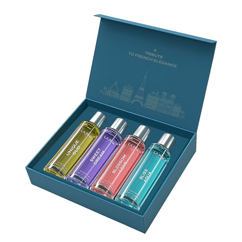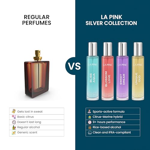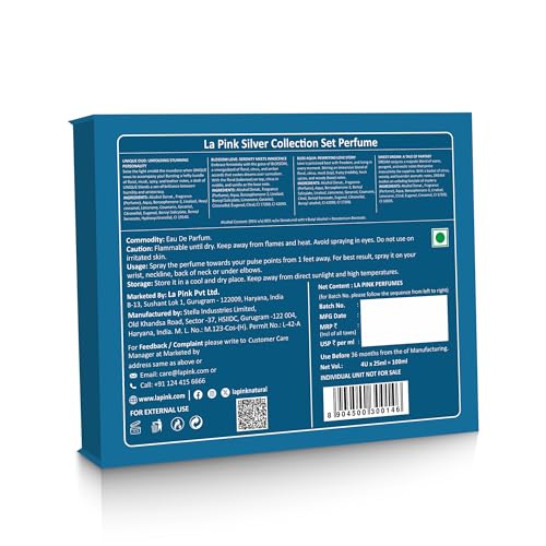 Discover the La Pink Silver Collection, an exquisite unisex fragrance set featuring four distinct 25ml Eau De Parfum variants – Bliss Aqua, Blossom Love, Sweet Dream, and Unique Oud. Each fragrance is meticulously crafted with sophisticated notes that complement both masculine and feminine sensibilities. The collection offers remarkable longevity, with scents lasting up to 10 hours on clothes and 6-8 hours on skin. These travel-friendly 25ml bottles are perfect for daily wear or special occasions, allowing convenient touch-ups throughout the day. The set includes premium formulations with proper safety sealing, presented in an elegant Silver Collection box that makes for an ideal gift. For optimal results, apply to pulse points – wrist, neckline, or under elbows – from a distance of 1 foot. Store in a cool, dry place away from direct sunlight and high temperatures. The fragrance originates from France and is manufactured in India by Stella Industries Limited, ensuring high-quality standards in every bottle.
