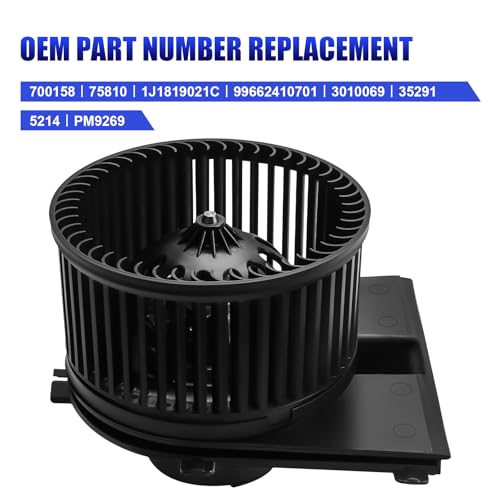 Replace Part Number: 700158, 75810, 1J1819021C, 99662410701, 3010069, PM9269 AC fan; Direct OEM design blower motor, drop-in and plug-in installation without special tools, it fits popular vehicles as 1998 1999 2000 2001 2002 2003 2004 2005 2006 2007 2008 2009 2010 VW Volkswagen Beetle Golf Jetta Audi TT