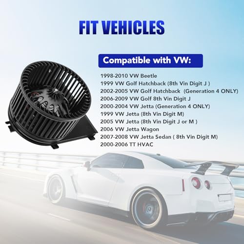 Compatibility: Blower Motor for 1998 1999 2000 2001 2002 2003 2004 2005 2006 2007 2008 2009 2010 VW Beetle | 1999 -2006 VW Golf | 1999-2005 VW Jetta | 2000-2006 Audi TT