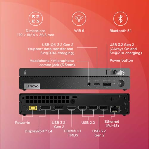 Ports: Front ports (1x USB 3.2 Gen 2 | 1x USB-C 3.2 Gen 2 | 1x headphone / microphone combo jack (3.5mm)) | Rear Ports: 1x HDMI 2.1 TMDS | 1x DisplayPort 1.4 | 2x USB 2.0 | 2x USB 3.2 Gen 2 | 1x Ethernet (RJ-45)