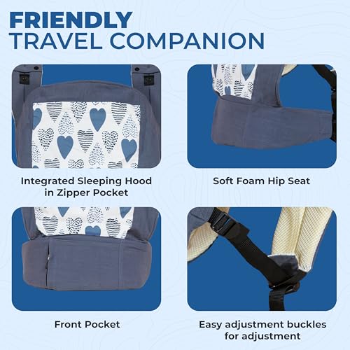 Integrated sleeping hood in zipper pocket. Front storage pocket on waist belt to store pacifier or other essentials