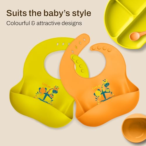 LuvLap Silicone Baby Bib for Feeding & Weaning Babies & Toddlers, Waterproof, Washable & Reusable, Non Messy Easy Cleaning, No Bad Odour, Adjustable Neckline with Buttons (Yellow)