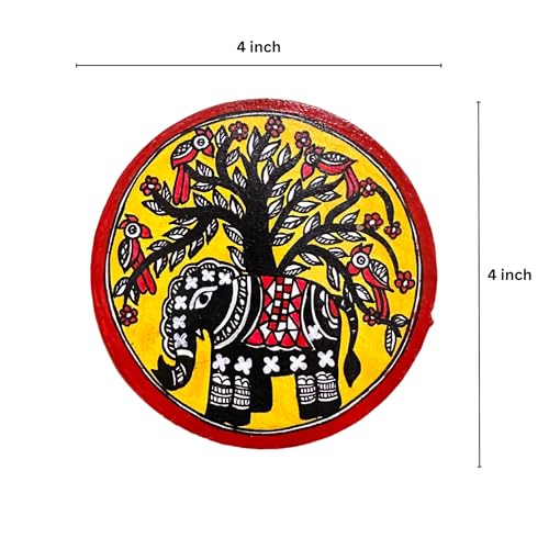 Set of 4 Round Wooden Coaster. :: 10 mm Thickness And 4 Inch Diameter Authentic Madhubani Art: Hand-painted with detailed, colorful patterns. Premium Wood Construction: Made of Maple Wood, Durable and long-lasting .