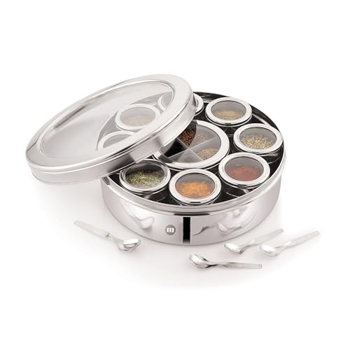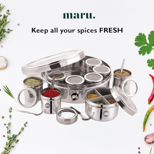 100% Food Safe, Durable Stainless Steel body of the masala box steel for kitchen. Care Instructions: Wash and wipe dry with a soft cloth before storing.