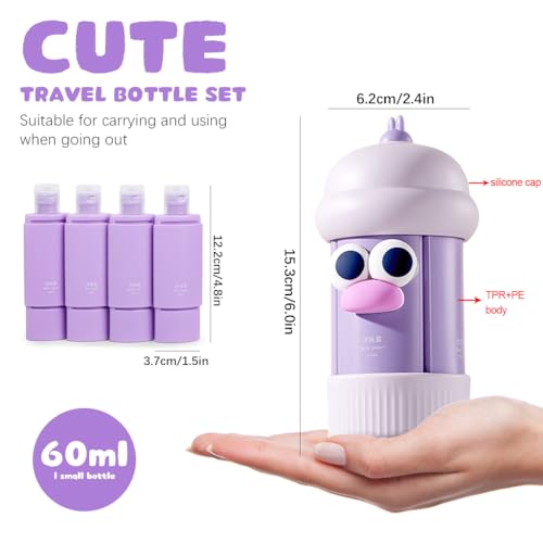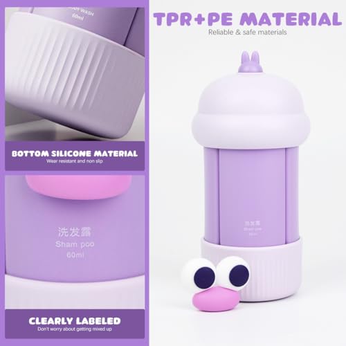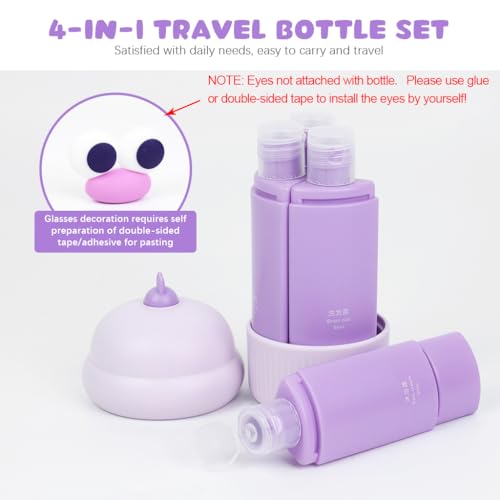 MODULAR DESIGN WITH CREATIVE HOLDERS: This travel set includes four 60ml silicone bottles that can be seamlessly connected into a single unit using the provided lovely holders. This modular design not only enhances portability but also adds a touch of fun and creativity, making your travel essentials easily manageable and stylish. NOTE: Eyes not attached with bottle, please use glue or double-sided tape to install the eyes by yourself!!!!