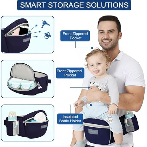 【Baby Carrier with Hipseat】- The side zipper pocket can put milk bottle, and the seat can hold daily baby supplies, such as diapers, wipes, and milk powder.