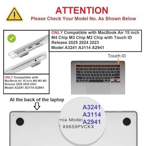 Perfect Fit: The case is designed only to be compatible with MacBook Air 15 inch M4 M3 M2 Chip with Liquid Retina Display & Touch ID — 2025 2024 2023 Release — Model: A3241 A3114 A2941 — MC7A4LL/A, MW1L3LL/A, MW1G3LL/A, MW1J3LL/A, MC7C4LL/A, MW1M3LL/A, MW1H3LL/A, MW1K3LL/A, MC7D4LL/A, MC6L4LL/A, MC6J4LL/A, MC6K4LL/A, MRYU3LL/A, MRYP3LL/A, MRYM3LL/A, MRYR3LL/A, MXD43LL/A, MXD23LL/A, MXD13LL/A, MXD33LL/A, MQKR3LL/A, MQKW3LL/A, MQKP3LL/A, MQKU3LL/A, MQKT3LL/A, MQKX3LL/A, MQKQ3LL/A, MQKV3LL/A. Please kindly check the model number on the back of the laptop as shown in the image