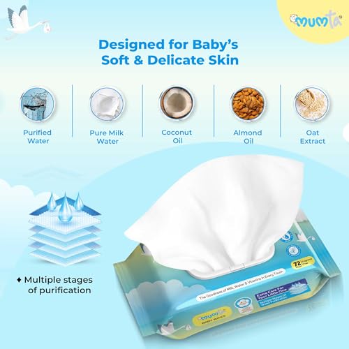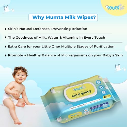 Mumta Milk Baby Wipes are specially designed to provide gentle, nourishing, and effective cleansing for your baby’s delicate skin. Infused with the goodness of Milk Water and essential Vitamins, these wipes offer deep hydration and nourishment while ensuring superior hygiene. The presence of Milk Water helps maintain the skin’s natural moisture balance, preventing dryness and leaving the skin feeling soft and smooth after every use. Babies have extremely sensitive skin, which can easily become dry and irritated, making it essential to use wipes that provide moisturization and protection without harsh ingredients. That’s why Mumta Milk Baby Wipes are carefully formulated to be super soft and moisturizing, ensuring a soothing experience every time you clean your baby’s skin. These wipes are about hydration and offer antibacterial protection, keeping your baby’s skin free from germs and bacteria.. The ultra-soft texture ensures that each wipe glides smoothly across the skin without causing friction or discomfort, making diaper changes and cleanup sessions a pleasant and soothing experience. Perfect for daily use, these wipes offer versatility beyond diaper changes. They can be used for gentle face and hand cleansing, removing dirt and food messes while leaving the skin hydrated and refreshed. Their super-soft material ensures that even the most delicate skin is cleaned without irritation. Whether at home or on the go, Mumta Milk Baby Wipes provide a convenient and safe solution for keeping your baby fresh, clean, and comfortable. Mumta Milk Baby Wipes are also great for adults with sensitive skin who prefer a natural, chemical-free cleansing option. Their compact and travel-friendly packaging makes them easy to carry in a diaper bag, purse, or travel kit. With every wipe enriched with nourishing ingredients, Mumta Milk Baby Wipes ensure that your baby’s skin remains soft, hydrated, and protected at all times. Give your baby the best care possible with a wipe as gentle as a mother’s touch.