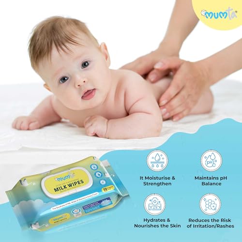 Mumta Milk Baby Wipes help prevent dryness and provide deep hydration by locking in moisture for long-lasting skin nourishment. Infused with milk water and essential vitamins, they create a protective barrier that keeps delicate skin soft, smooth, and refreshed. Perfect for daily use, these wipes ensure your baby’s skin stays hydrated, preventing irritation and maintaining its natural suppleness with every gentle wipe.