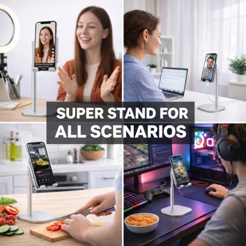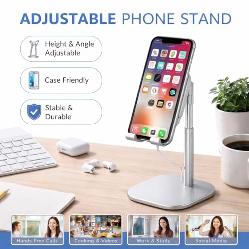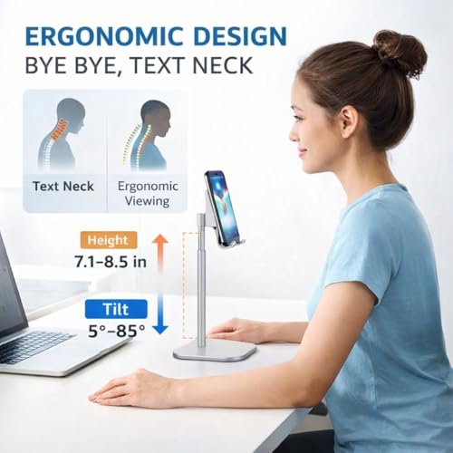 [ERGONOMIC DESIGN – BYE BYE, TEXT NECK] Your spine called—it’s tired of your phone habits. Our adjustable stand (7.1–8.5in height, 5°–85° tilt) lifts your phone and your posture. Perfect for TikTok chefs, Zoom warriors, and Netflix marathoners who still want a neck by 40.