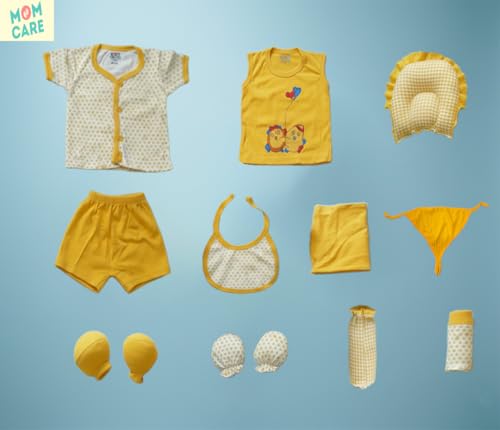 Newborn Set includes :Baby Gift Set Includes 11 pcs Clothes ( Half Tshirt,Sleeve less T shirt, Pant,Towel,Bib,Cap, Nappy,Pillow,Bottle cover,Mitten &Booties)
