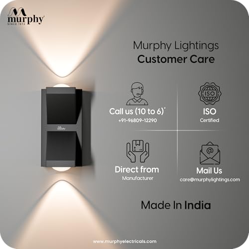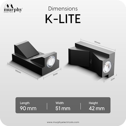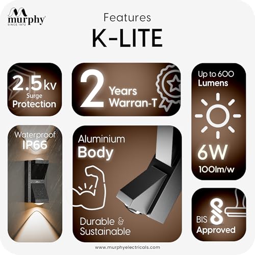 Enhance your outdoor spaces with the modern and powerful Murphy K-LITE LED Wall Light, designed for both performance and architectural aesthetics. Featuring a robust aluminium body, this light offers long-lasting durability and resistance against rust and environmental wear. Its IP66 waterproof rating makes it ideal for outdoor applications such as boundary walls, entrances, balconies and building facades. With brightness up to 600 lumens, it provides effective illumination for decorative and functional outdoor lighting. Built to handle Indian electrical conditions, it includes 2.5kV surge protection and is BIS Approved, ensuring safety and dependable performance. Backed by a 2 Years Warranty, Murphy K-LITE delivers a perfect combination of durability, protection and modern design for exterior lighting needs.