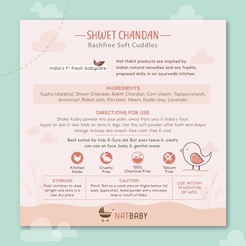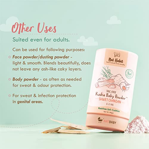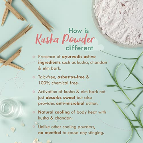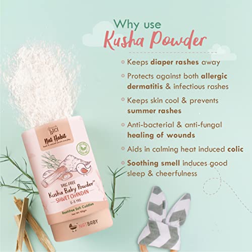How to Use: Shake Kusha powder into your palm, away from your & baby’s face. Apply on skin & skin folds on arms & legs. Use this soft powder after bath and diaper change to keep skin sweat-free, rash-free & cool. Best suited for kids 0-5yrs old. But even older kids, teens & adults can use it on the face, body & genital areas.
