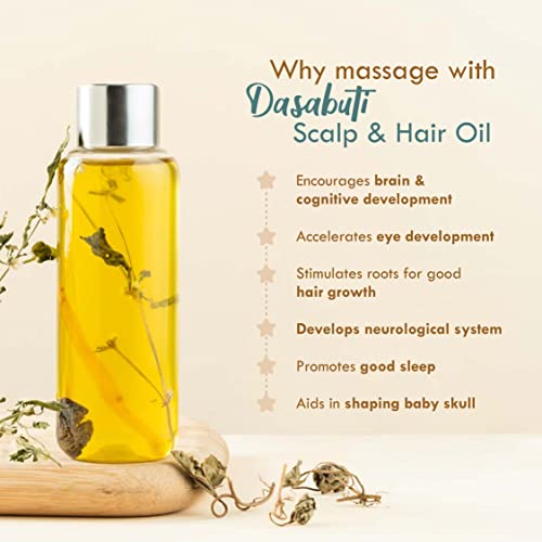 Supports Brain & Eye Development : A daily head massage with this traditional Dasabuti oil aids in overall brain function, cognitive sharpness, and visual health.